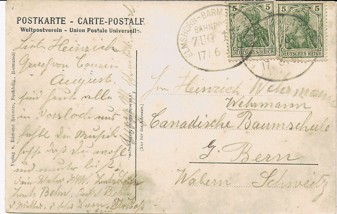 1) eine mit 6 Pfg überfrankierte Postkarte der Elmshorner Nachrichten nach Barmstedt. Es handelt sich um einen eiligen Inseratsauftrag an die Barmstedter Zeitung. Die Karte wurde direkt zum Zug gebracht und der Eile war wohl auch die 6 Pfg. (statt 5 Pfg.) Frankatur geschuldet.
