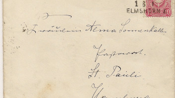 Mit der Verlängerung nach Itzehoe erhielt die Bahnpost erstmals einen Streckenstempel (vorher gab es nur Bahnhofstempel). Aus dieser Zeit ich einen leider nicht perfekt erhaltenen Brief aus dem Jahr 1863. Er ist mit einer dänischen 4 Skilling Marke der Ausgabe 1863 (mit Durchstich) frankiert. Die Marke wurde mit dem Nummernstempel 206 entwertet, daneben ist der Bahnpoststempel "Elmsh.-Itzeh. Ebn.Post Bur. 12.9.1865" abgeschlagen.
