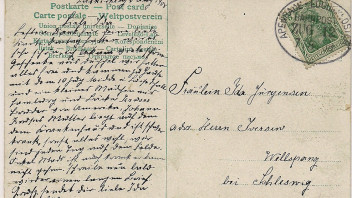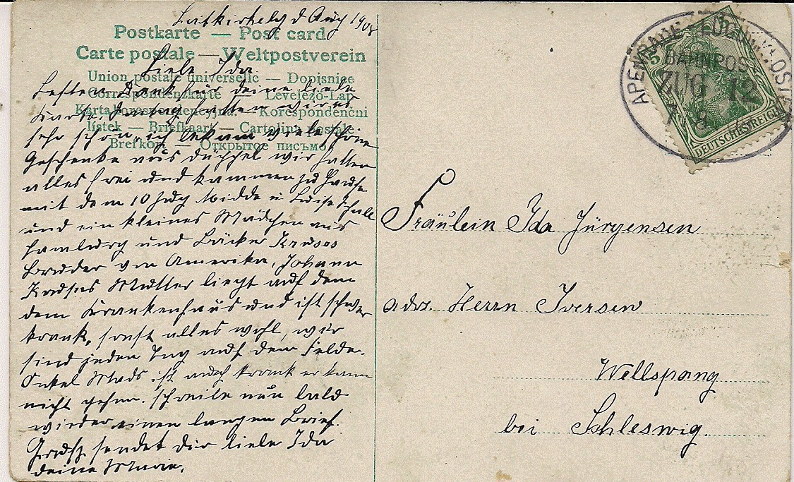 Meine Postkarte wurde laut handschriftlicher Datierung in Loitkirkeby am 7. August 1908 geschrieben und in den Bahnpostbriefkasten eingeworfen und mit dem Bahnpost-Ovalstempel "Apenrade-Lügumkloster Bahnpost Zug 12 7/8.08" abgestempelt. Diese Bahnpost-Ovalstempeltype ist gemäß DAKA "Sønderjylland" Katalog aus dem Jahr 1999 vom 13.09.1902 bis zum 09.02.1920 mit den Zugnummern 7,10-17, 19-20, 22-24 und 26 registriert.