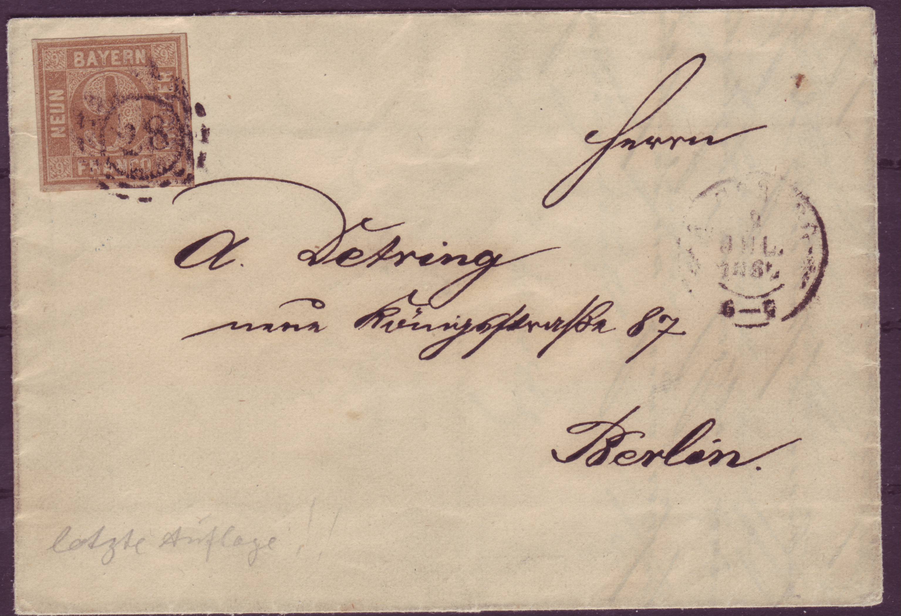 Dein Brief wog bis 1 Loth und brachte Bayern 8 Kr. ein. Das Weiterfranko wurde korrekt in rot mit 10 Kr. ausgewiesen.