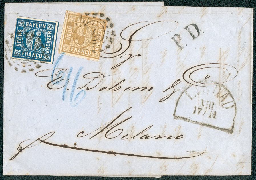 Der 1. aus Augsburg lief am 11.7.1863 nach Mailand. Die Frankatur mit 18 Kr. war treffend, jedoch unterließ man es wieder mal in Augsburg, die Weiterfranko anzuschreiben, wie so oft ...