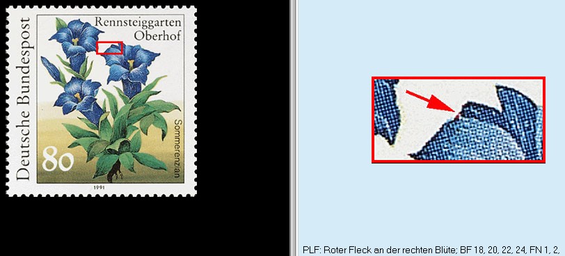 Dennoch ist der Plattenfehler "Roter Fleck an der rechte Blüte" bestätigt und bei Michel katalogisiert (letzters hat nicht viel zu sagen, da Michel hin und wieder Plf rausschmeist).Beste Grüße