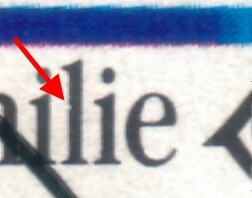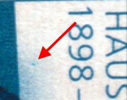 1. Druckabweichung: Blauer Strich unter der "9" von "1898"