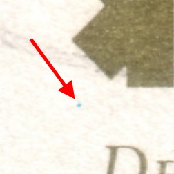 Zwei blaue Punkte am Markenrand unten links - unter der "0" der Wertziffer "10" und rechts daneben