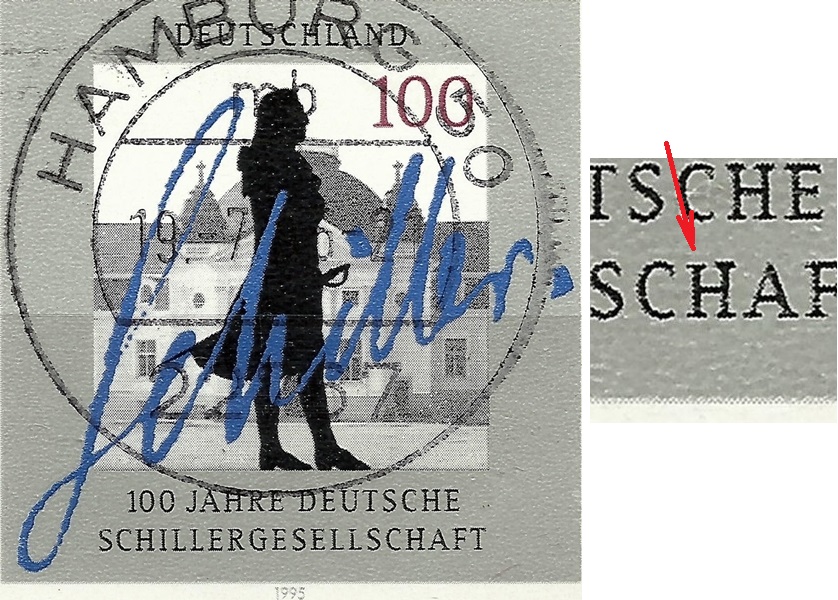 Hallo Plattenfehlersammler, sehr wenig Aktivitäten bei den Sammlern der BRD-Abarten. Deshalb einmal wieder die Vorstellung eines Mehrfachfundes. Mi - Nr. 2552 mit zwei kleinen grauen Punkt oben im "H" von "SCHINKEL". Weitere Neufunde unter