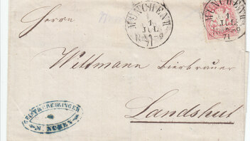 Ein Brief von Münchnen nach Landshut - nix besonderes, was mir jedoch ins Aug sticht ist der schöne filigrane Stempel - leider hab ich keine Stempelhandbuch von Bayern, aber vielleicht kann mit ja einer helfen ?(