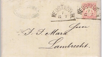 Abgesendet wurde er in Neustadt/Haardt am 12.7.1875, angekommen in Lambrecht ist er noch am gleichen Tag. Entwertung der Marke und Aufgabestempel HK Neustadta/H, Ankunftsstempel Einkreis von Lambrecht.