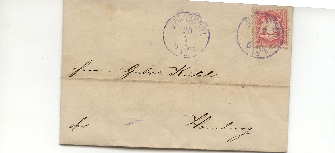 1. Der blaue - fast schon grünlichblaue - Stempel (Winkler 20b) zusammen mit der ähnlich blauen Unterstreichung der Adresse kontrastieren optisch hervorragend mit der Marke