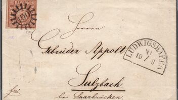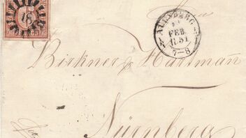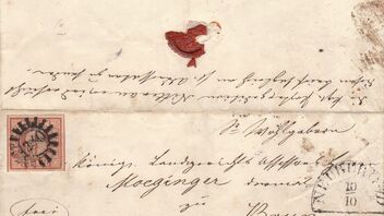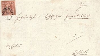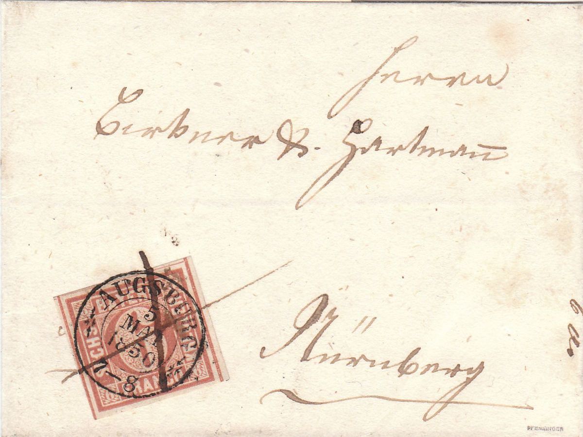Der 1. Brief zeigt eine 4I aus Augsburg vom 5.5.1850 nach Nürnberg. Da die beiden Orte in direkter Linie über 12 Meilen voneinander entfernt lagen und noch immer liegen, muss der Brief bis 1 Loth inklusive gewogen haben.