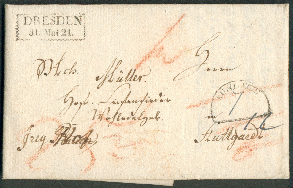 Teilfrankobrief von Dresden nach Stuttgart vom 31. Mai 1821.