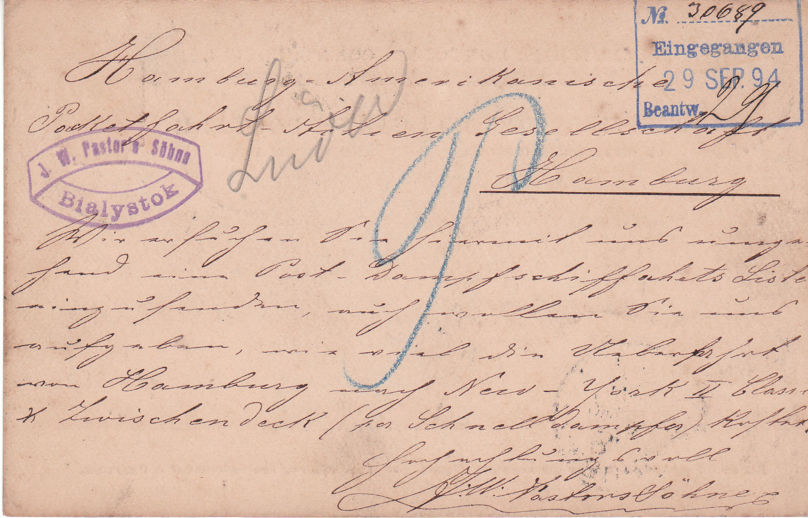 Packetfahrt-Actien GesellschaftWir ersuchen sie hiermit uns umgehend eine Post-Dampfschiffahrts Liste einzusenden, auch wollen sie uns aufgeben, wie viel die Überfahrt von Hamburg nach New-York II Klasse Zwischendeck ( per Schnelldampfer ) kostet.