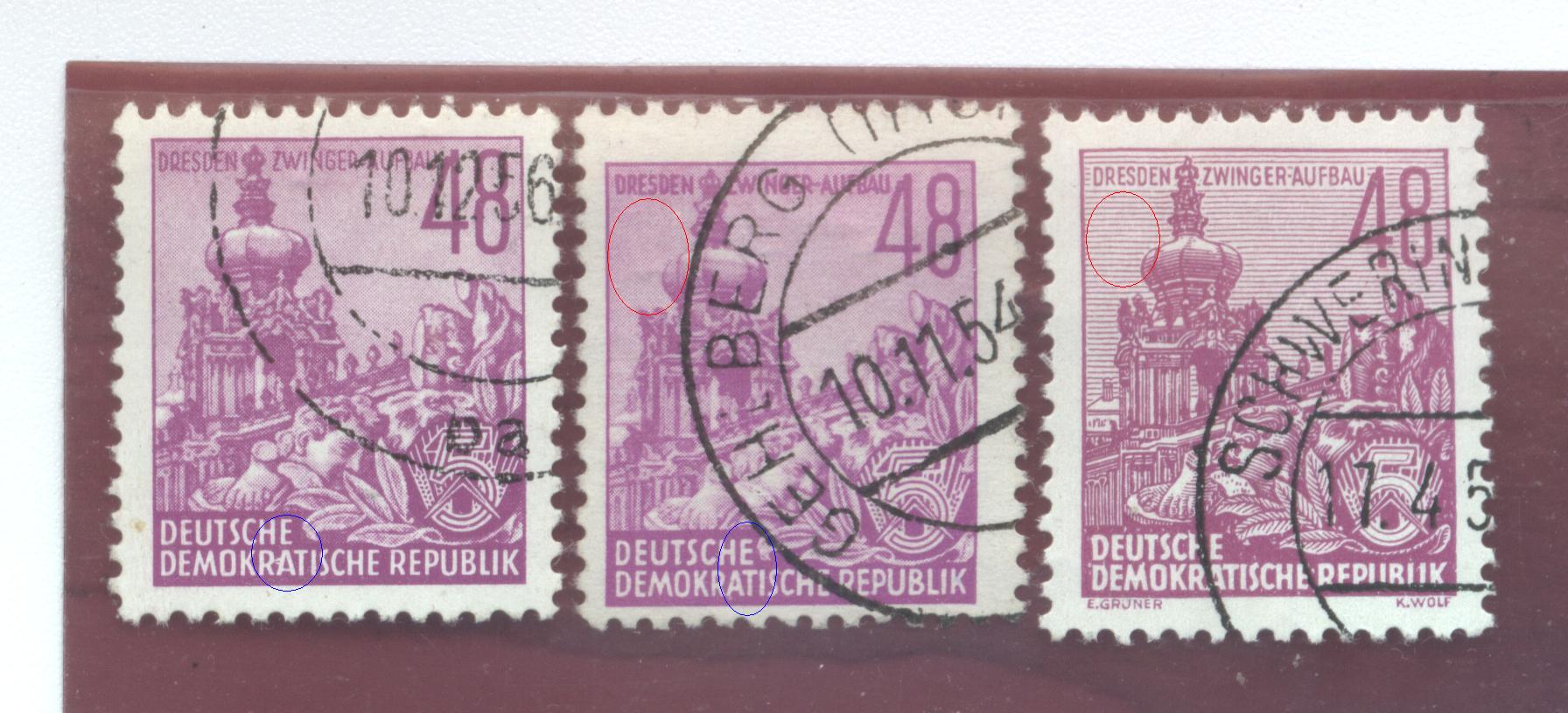 Noch was: Die erste und dritte Marke ist für Sammlerzwecke mit Klischeestempel, die zweite ist der Urdruck mit postalischer Entwertung.