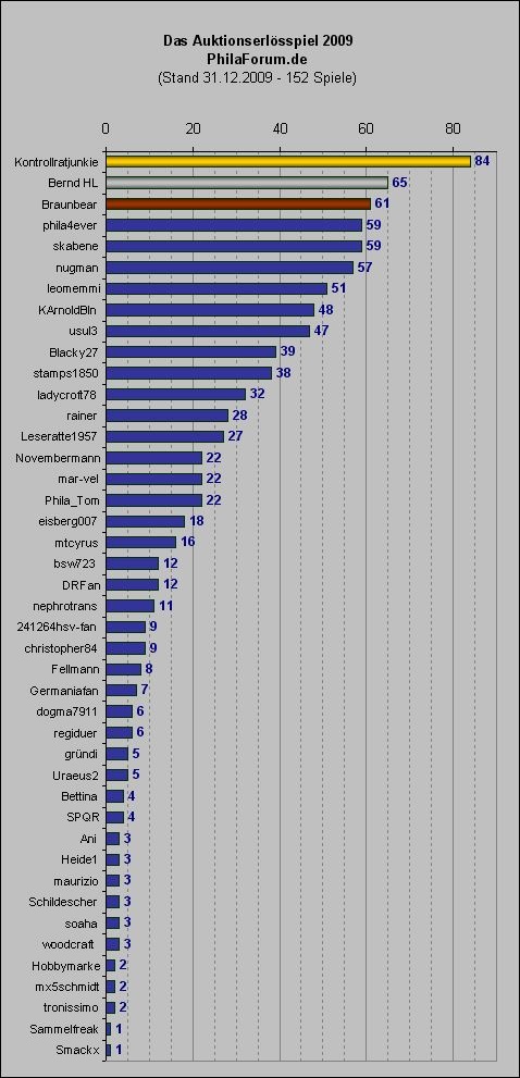 Nachdem das ursprüngliche Auktionserlösspiel nun mehr 19 Monate gelaufen ist und Tips für 247 Auktionen abgegeben wurden, wurde es mal Zeit einen Abschluß zu finden. Dies heißt jedoch nicht, dass das Spiel eingestampft wird. Es wird weitergeführt, jetzt jedoch mit einer jährlichen Rangliste. D.h. dieses Spiel läuft vom 1.1.2009 bis zum 31.12.2009. Die erste Tipprunde ist noch im alten Thread gespielt worden.