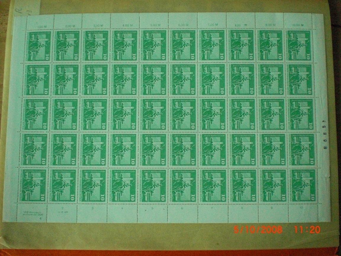 Heute biete ich einen kompletten postfrischen Bogen der 10-Pfennig-Bauten (Großformat) mit Besonderheit an. Statt dem Zählbalken der 10-Pfennig-Bögen hat dieser den Satzfehler "Zählbalken der 20-Pfennig".
