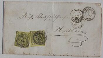 Bis 30.6.1858 war die innwürttembergische Taxen für Brief über 12 Meilen gleich 6 Kreuzer pro Loth.
