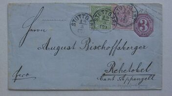 Ich möche heute einen Brief zeigen, der etwas aus der Zeit liegt, die hier eigentlich gezeigt werden sollten. Diese ist vom 19.05.1873 von Stuttgart nach Rehetobel in die Schweiz gelaufen. Die Ganzsache mit seltenem Doppeldurck der Marke und auffrankiert mit 1 und 3 Kreuzer.