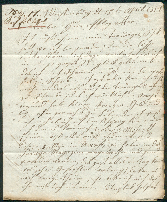 das Schreiben ist an das im Landgericht Vilsbiburg gelegene Patrimonialgericht Altfraunhofen gerichtet. Der Oberst im 3. Chevauxlegers-Regiment Niedermayer teilt darin mit, dass der Soldat Andreas Schändl vom Russland-Feldzug "nicht bis jetzt wieder" zurückgekehrt ist. Ein philatelistisch wie menschlich ebenso interessantes wie berührendes Dokument.