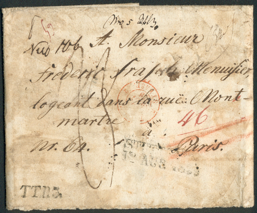 Der Brief war in Paris nicht zustellbar (siehe verschiedene Stempel auf der Siegelseite). Er ging daher nach Stuttgart zurück und mußte,