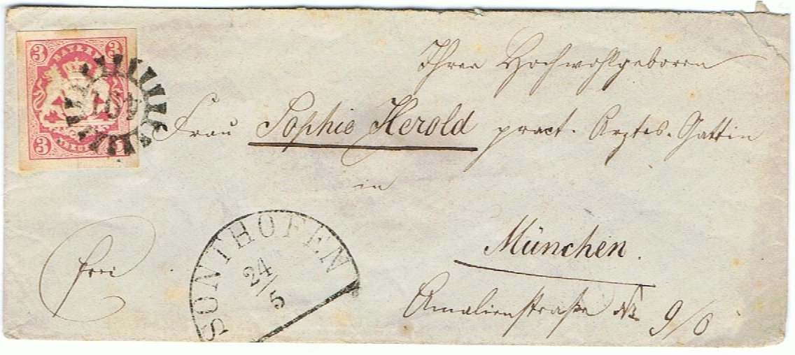 Hier ein Brief von Sonthofen nach München. Abgeschickt am 24.5., Jahr leider unbekannt, da die Marke jedoch noch den gMR 491 von Sonthofen trägt, kommen nur 1867/68 in Betracht.