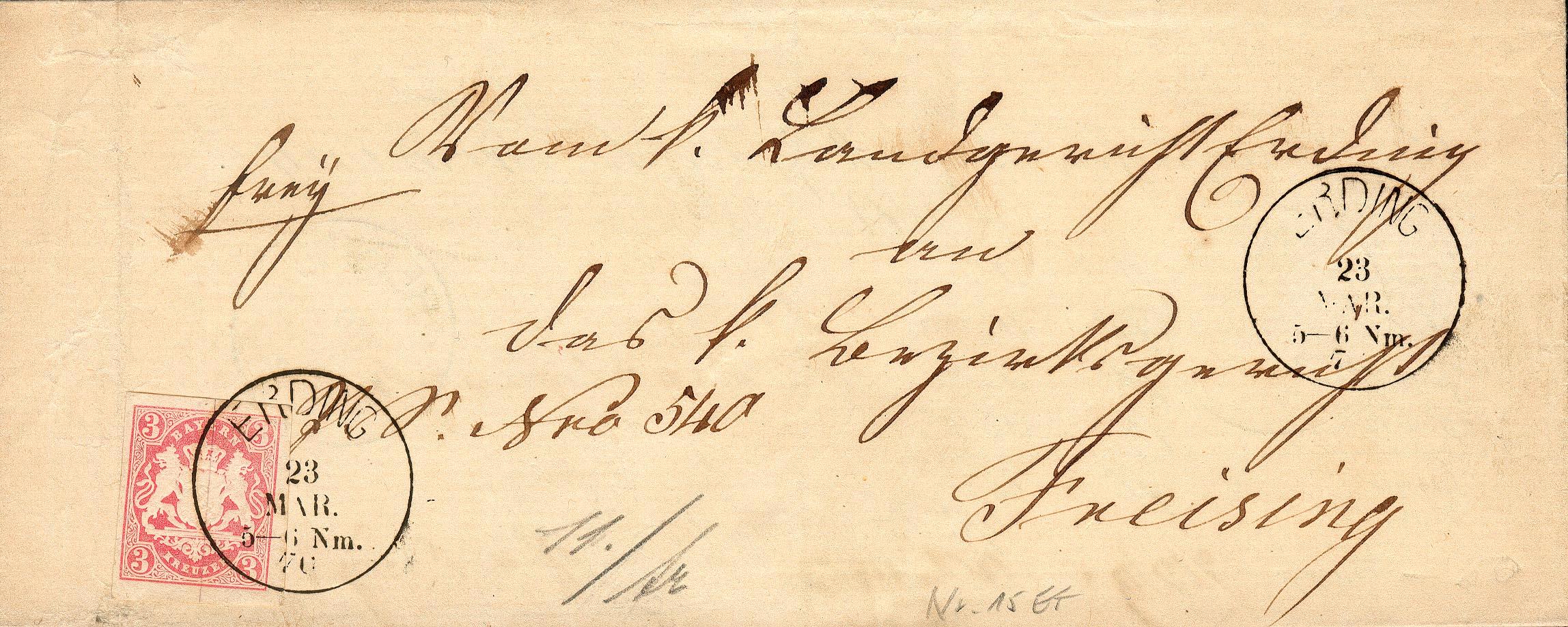 Bald nach der Eröffnung der Bahnlinie München-Landshut (1858) gab es einen Postomnibus von Erding nach Freising. Wenn die Post für Landshut vorsortiert war, bekam sie wohl auch keinen Stempel, der den Weg über Freising (und die Bahnlinie) belegen könnte.