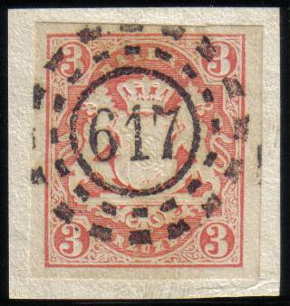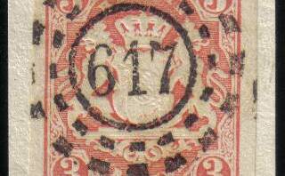 Ich habe auch eine VE mit dem 617 auf Briefstück, eine Nr. 9, die auch nicht geprüft werden konnte. Das Stück ist seit 30 Jahren in meiner Sammlung - damals wusste ich noch nicht, dass es so etwas überhaupt gab, und der fast 90jährige Sammler, von dem ich es erwarb, hat es noch damals aus dem Brief geschnitten, der an seinen Großvater1867 adressiert worden war.