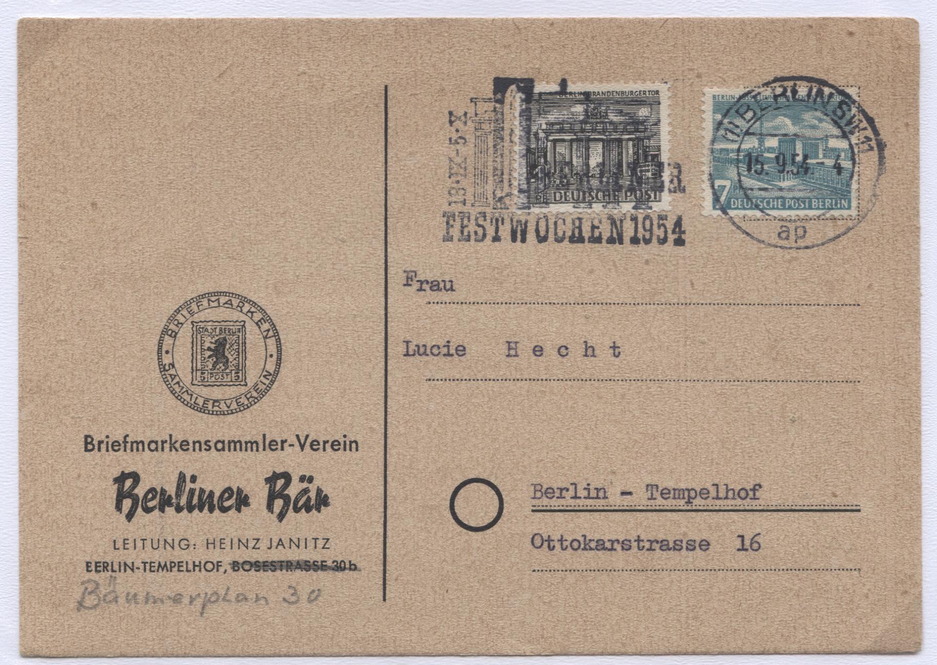 hier eine Postkarte von 1954 mit Mi.Nr.42 Motiv des Brandenburger Tors abgestempelt zu den Festtagswochen.