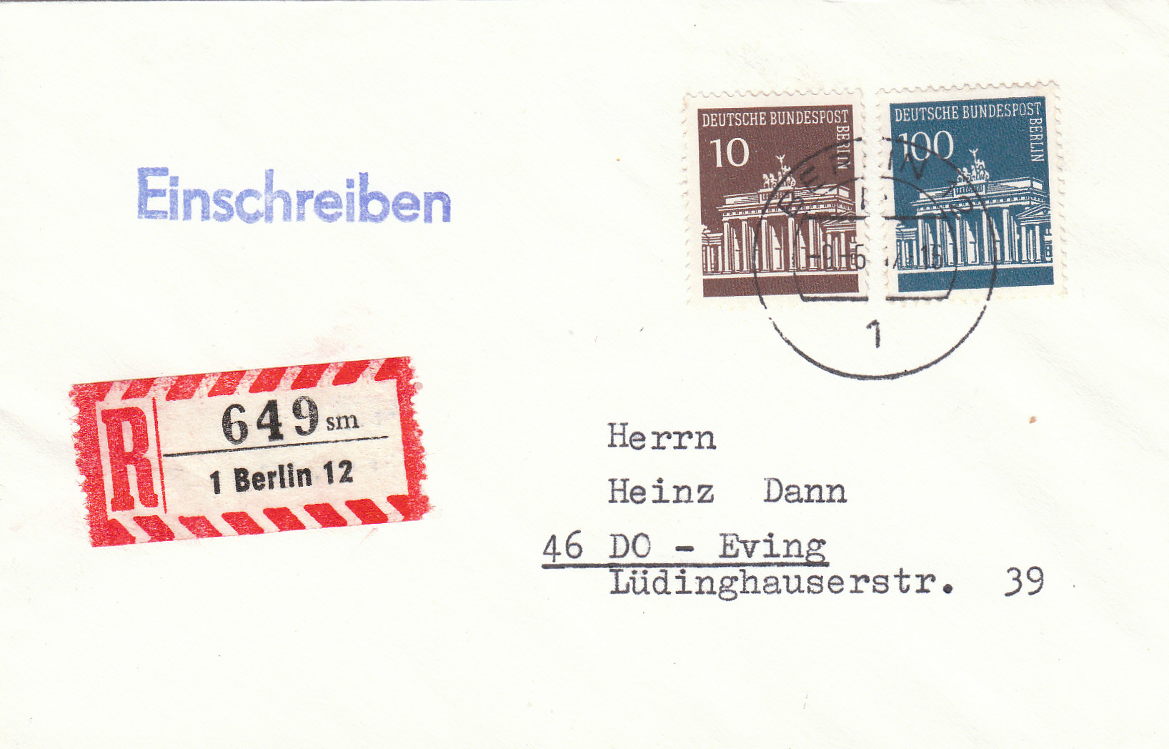 Hier ein Standardbrief bis 20 g im Fernverkehr, Porto 30 Pf, per Einschreiben, Porto 80 Pf, ergibt die Portostufe 110 Pf, am 9.6.67 portogerecht freigemacht mit einem 100 Pf Wert sowie einem 10 Pf Wert der DS Brandenburger Tor, Ausgabe Berlin, gelaufen ab BERLIN 12 ins Bundesgebiet nach Dortmund.