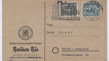 hier eine Postkarte von 1954 mit Mi.Nr.42 Motiv des Brandenburger Tors abgestempelt zu den Festtagswochen.
