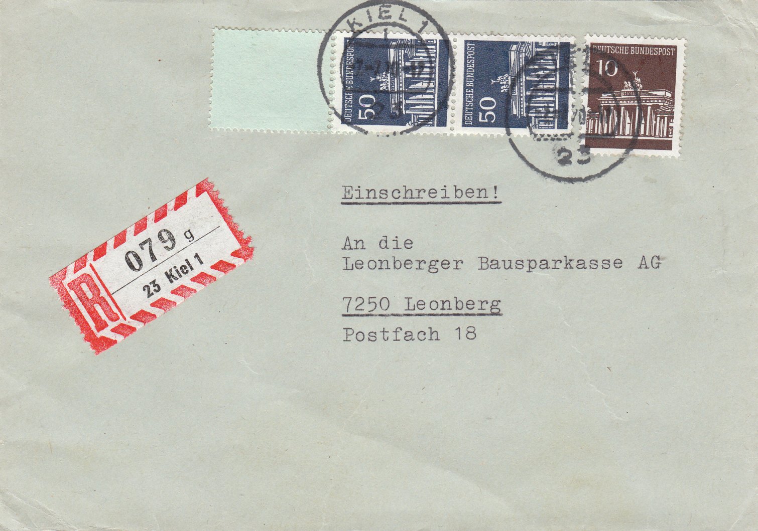 Standardbrief im Fernverkehr, Porto 30 Pf, per Einschreiben, 80 Pf, ergibt die Portostufe 110 Pf, hier am 7.2.70 portogerecht als FaF mit drei Werten der DS Brandenburger Tor, Ausgabe Bund, dargestellt.