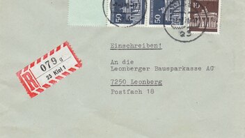 Hier ein Standardbrief bis 20 g im Fernverkehr, Porto 30 Pf, per Einschreiben, Porto 80 Pf, ergibt die Portostufe 110 Pf, am 9.6.67 portogerecht freigemacht mit einem 100 Pf Wert sowie einem 10 Pf Wert der DS Brandenburger Tor, Ausgabe Berlin, gelaufen ab BERLIN 12 ins Bundesgebiet nach Dortmund.