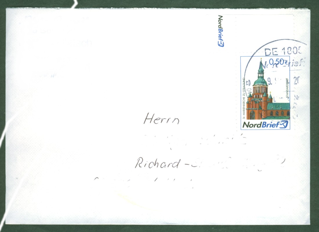 Gestern hatte ich mal wieder einen NordBrief erhalten - es ist die Ost-Version mit den Marken, die eine Zähnung in der Qualität der AM-Post-Marken von 1945 haben. Dass die das im Jahr 2010 nicht besser hinbekommen ist schon mehr als merkwürdig! Zuvor hieß das mal "OstseePost" (da war die Zähnung auch schon in dieser minderen Qualität!) und hat seit kurzem auch den hier üblichen Namen NordBrief angenommen. Die Portostufen sind offenbar einheitlich 40, 50, 80, 130 und 200 Cent für Postkarte, Standardbrief, Kompaktbrief, Großbrief und Maxibrief!