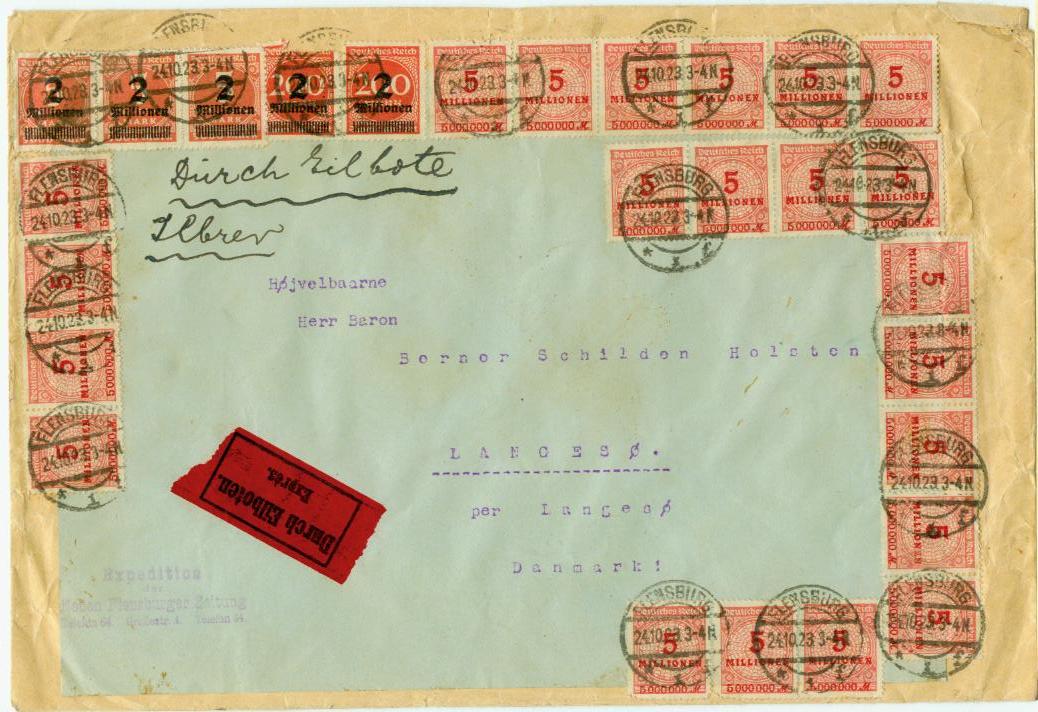 Sendet von Flensburg am 24.10.1923 nach Langesø auf Fuhnen in Dänemark. Gewicht 40 - 60 g