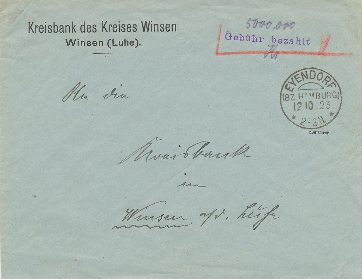 Zuerst ein Fernbrief der I. Gewichtsstufe bis 20g von der Kreisbank in Winsen aus der Portoperiode vom 10.10. - 19.10.23