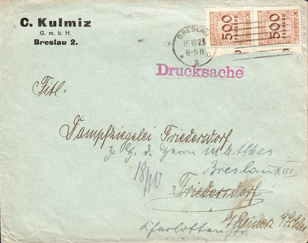 Aber ich komme mit dem Porto nicht klar. Es handelt sich um einen Ortsbrief, der in der Portoperiode 21 eigentlich mit 4 Millionen Mark zu frankieren war. Das Porto von 2 Millionen galt nur für Drucksachen bis 25g und Ortspostkarten. Da der Beleg aber von Grimm, Zirkenbach und Peschl noch vor dem 2. WK in Kommission geprüft worden ist, muss es damit wohl seine Richtigkeit haben.