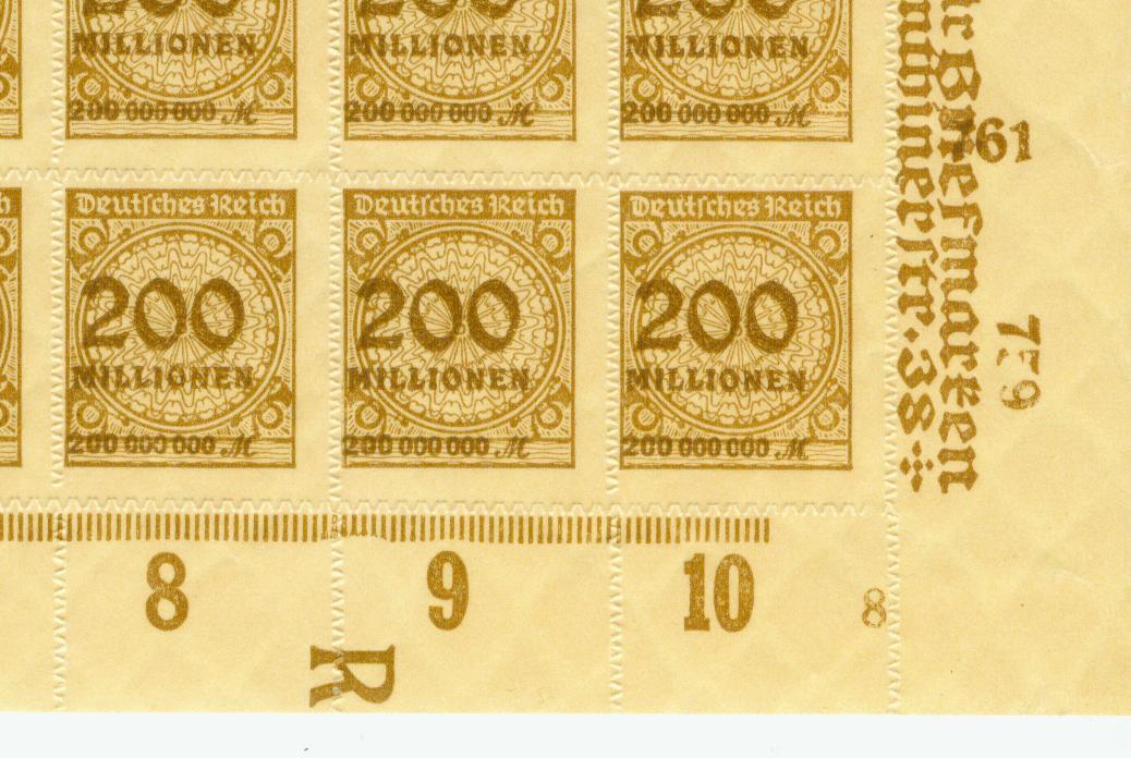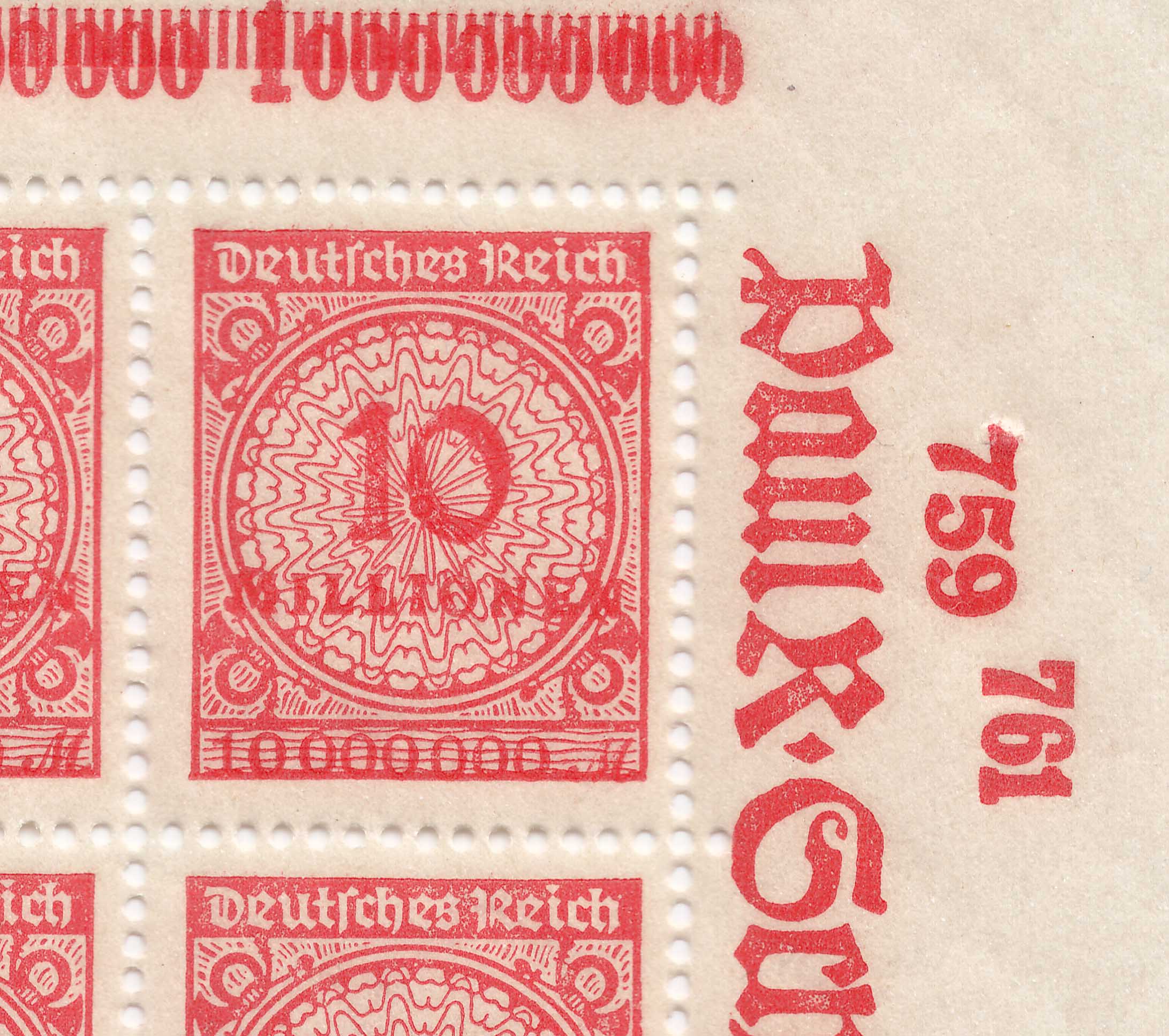 Der Bogen der 10 Millionenmarke 318 A wurde im Oktober 1923 gedruckt.