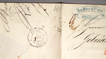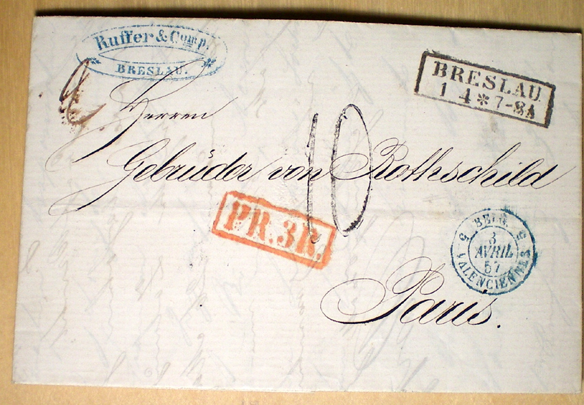 der Portobrief (so hießen gebührenpflichtige Briefe damals, für die der Absender nichts bezahlt hatte) von Breslau nach Paris wurde von der Aufgabepost nur mit dem Ortsstempel bedruckt.
