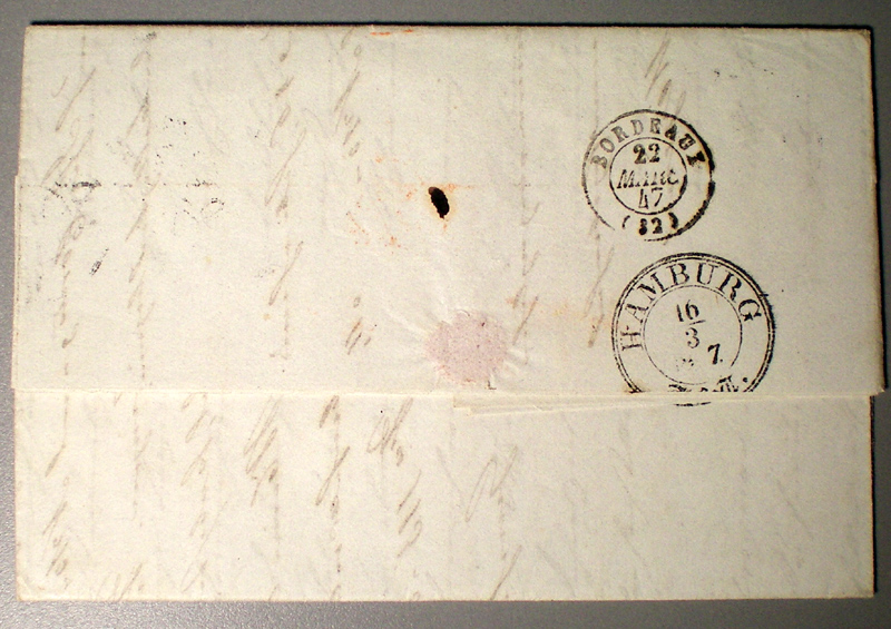 Der Brief sollte nach dem Willen des Absenders bis Hamburg frankiert werden. In Hamburg wurde der Brief aber Taxis übergeben. Damit ergab sich das Problem, dass Frankreich 1847 von Taxis keine teilfrankierten Briefe aus dem taxisschen Postbezirk und den sgn. Nordstaaten (wozu Mecklenburg gehörte) mehr annahm. Der Freivermerk wurde also gestrichen und Mecklenburg erhielt 4 Hamburger Schillinge als Portoanteil von Taxis, die angeschrieben und gestrichen sind.