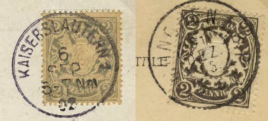Hier ein Ausschnitt einer Ganzsache mit abweichender Farbtönung im Vergleich mit der Normalfarbe.
