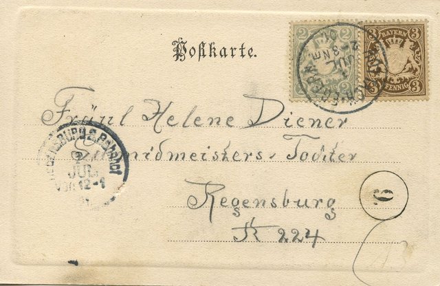 Anhand der Adresse Landwehrstraße (in der Ludwigsvorstadt) müsste doch der Briefträgerstempel entziffert werden können ![]()