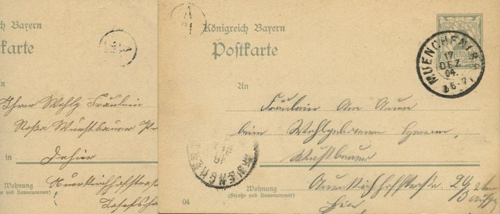 Danke für Deine Antwort. Ja, um München herum zu kommen, geht nicht gut. Da würde man auf manch schönes Briefchen oder Postkarte verzichten müssen. Hier der Scan von 2 Karten mit der gleichen Anschrift, aber nach meiner Meinung mit 2 unterschiedlichen Briefträgerstempeln - A 21 und A 23 (Dez. 1904). Nur so mal überlegt: Die Landbriefträgerstempel hatten doch immer schon einen Buchstaben, die Stadtbriefträgerstempel keinen. Könnten diese für die Neuanfertigung der Stadtbriefträgerstempel in den neuen Stadtteilen (Eingemeindungen) "Pate" gestanden haben?
