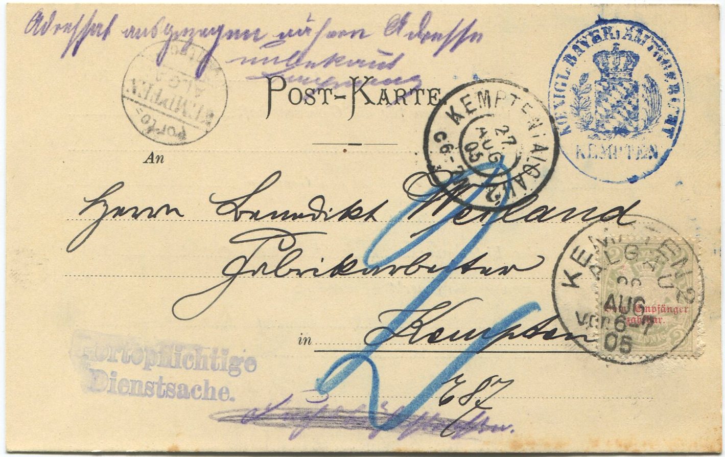 Postkartenporto 5 Pfg.) nicht erhoben.