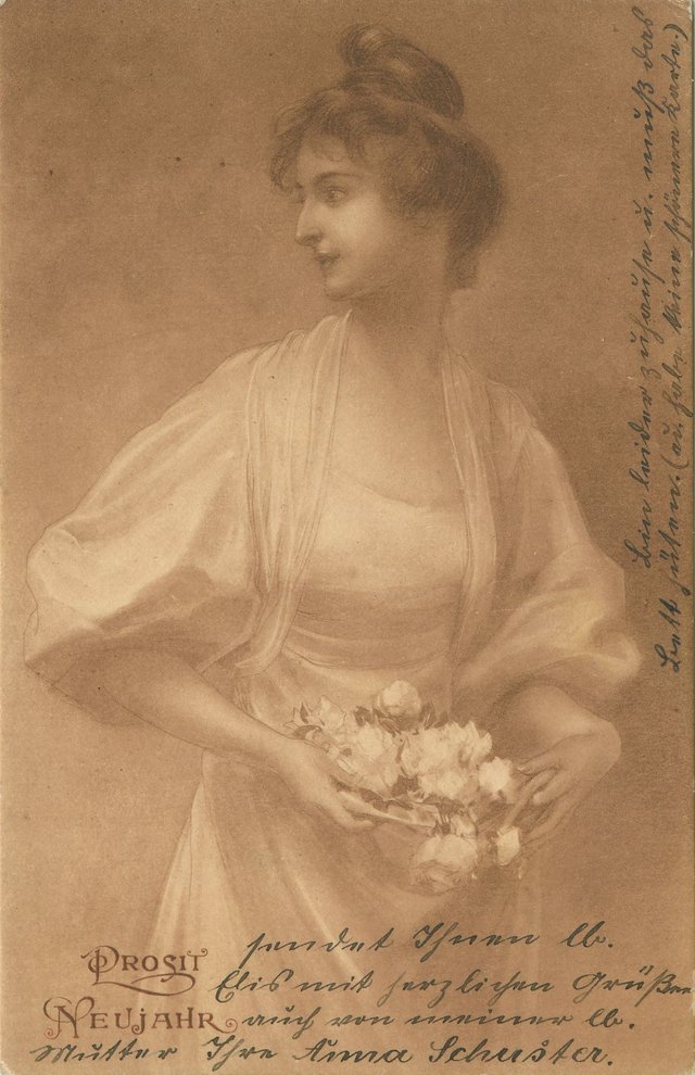 Doch was mir die alten Karten heute noch erzählen und welche (Ouer-) Informationen sie heute noch geben, das macht mir große Freude. So frage ich, wer hat hier an wen und warum geschrieben? Angesichts der bildschön geschriebenen Anschrift braucht man kein Kriminaler zu sein, um anzunehmen, dass dies eine Frau geschrieben hat. Die in Schönschrift niedergebrachte Mitteilung auf der Bildseite, die doch überrascht, kann man auf ein junges Fräulein (Schülerin einer höheren Mädchenbildungsanstalt?) schließen, die ihrer Freundin, da sie “das Bett hüten musste”, einen Neujahrsgruß sandte. Ich denke, dass ihre Entschuldigung “ich habe keine schönere Karte” heute nicht mehr erforderlich ist, im Gegenteil, sie ist doch sehr hübsch.