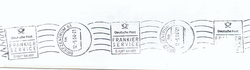 Hinzufügen sollte ich vielleicht, dass es zu allen Zeiten vorkam, dass die Post Absenderfreistempelmaschinen gelegentlich zur Entwertung von Marken oder auch als Postfreistempel benutzt hat. Um eine solche Nutzung einer Absenderfreistempelmaschine zur Stempelung von fuer den Frankierservice eingelieferter Post mag es sich bei dem von tigo gezeigte Exemplar zu handeln. Dies wuerde den Beleg von tigo aber trotzdem nicht zu einem Frankit-Beleg machen.