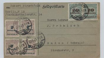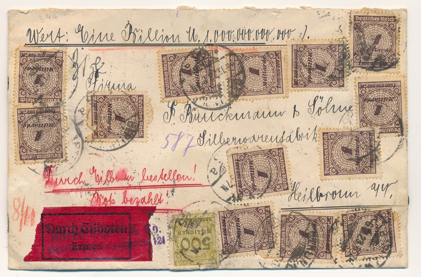 Frankiert mit einer 30 Pfg. Marke (Mi. D20) und einer 1 Mk. Marke (Mi. D30). Briefporto PP5 (6.5.20 bis 31.3.21): 40 Pfg, Zustellgebühr PP5: 50 Pfg, Briefporto für Rücksendung der Urkunde PP5: 40 Pfg, zusammen 1 Mk, 30 Pfennig.