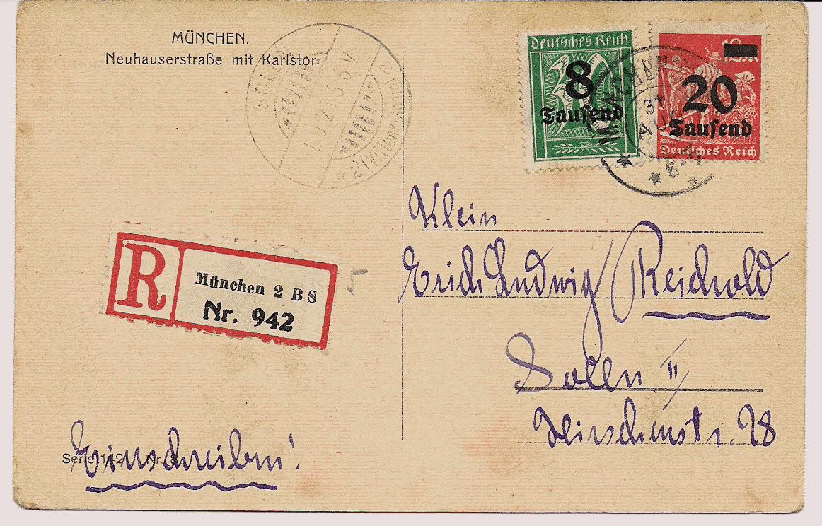heute zeige ich eine (philatelistisch beeinflusste) eingeschriebene Postkarte (Ansichtskarte ohne Text vom Karlstor in München) aus der Portoperiode 16.