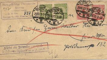 Schaue hier ein Wertbrief aus Karslruhe nach Berlin, sendet am 27.11.1923, in der vierfachperiode. Wertangabe 1440 Mrd. Mark. Gewicht 53g.