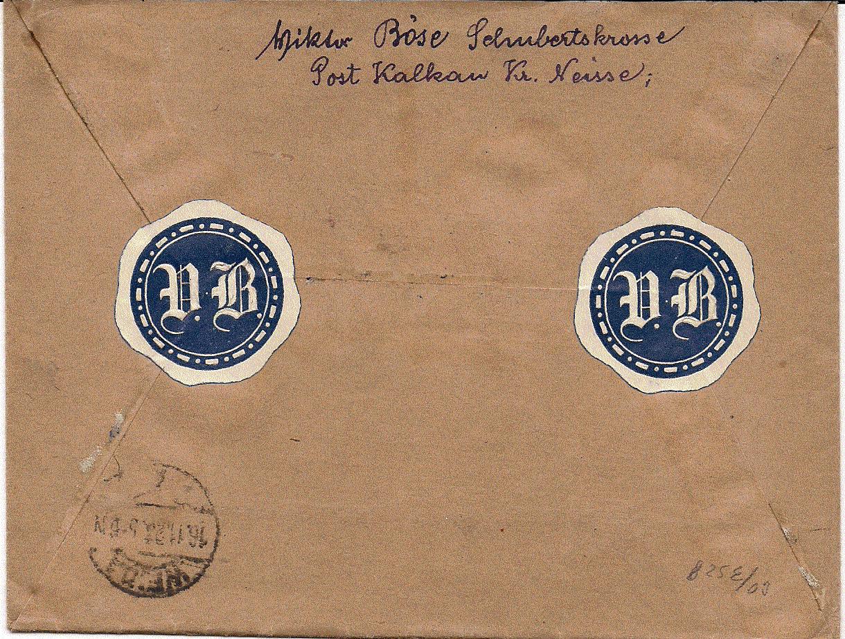 Rückseitig der Ankunftstempel "Plauen 1m Vogtland 22.10.23 4-9V" Also ganz schön lang für einen Inlandseilbotenbrief unterwegs gewesen.