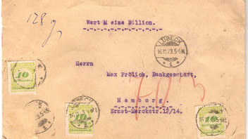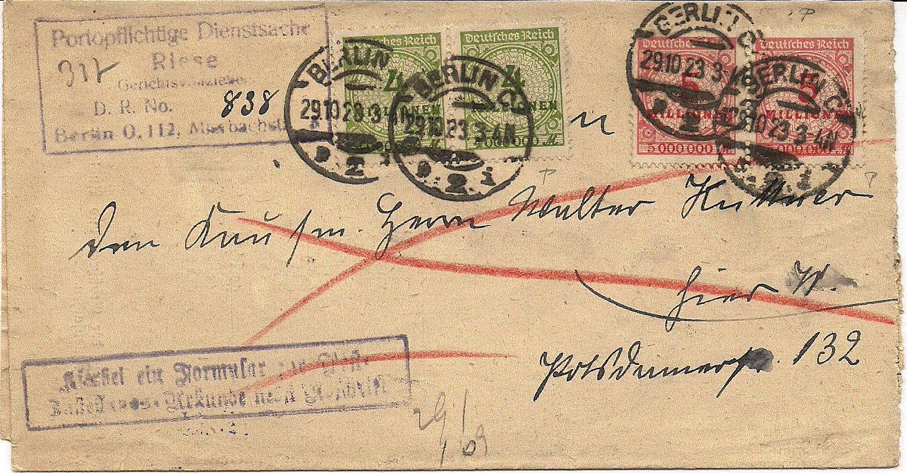 Briefgebühr 112 Mrd. Einschreibegebühr 80 Mrd. und Wertbebühr 2% je Mrd. Mark = 28,8 Mrd alles zusammen 220,8 Mrd. Mark. also ein überfrankierung von 99,2 Mrd. Mark.