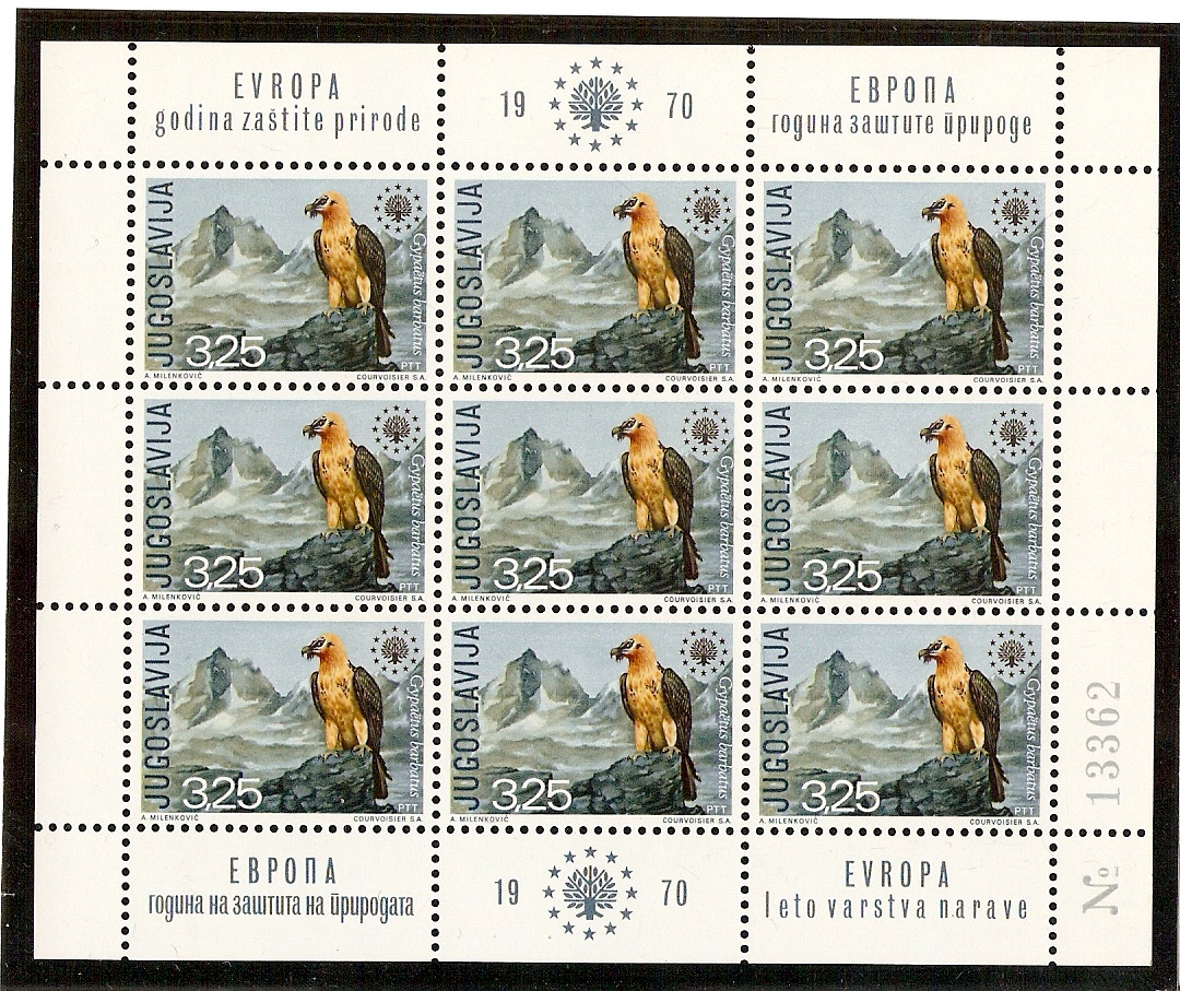 Aus Jugoslawien von der Ausgabe Europäisches Naturschutzjahr 1970 der Bartgeier im Kleinbogen.