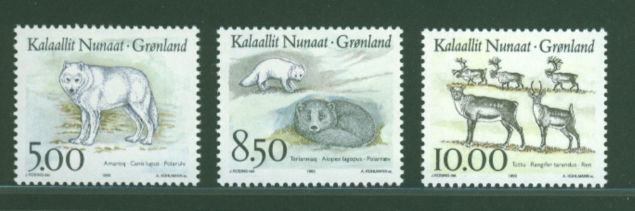 Zuerst die Serie Mi.Nr. 274 - 276 aus dem Jahre 1995 mit Großwild Grönlands (Eisbär, Vielfraß, Moschusochse).